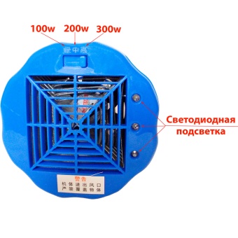 Мини тепловентилятор – отличный вариант обогревателя для брудера, курятника, птичника, клеток и других помещений, где содержатся птицы и животные. Он вкручивается в стандартный патрон для ламп Е27 (настоятельно рекомендуется использовать керамический патрон). Корпус сделан из термоустойчивого пластика, исключающего оплавление; внутри установлен вентилятор, прогоняющий воздух через нагревающие спирали, изолированные от пластиковых частей корпуса отражающими экранами. Регулировка позволяет устанавливать три варианта мощности – 100, 200 и 300 Вт – переключением трехпозиционного тумблера, который включает последовательно нагревающие спирали (при максимальной мощности 300 Вт задействованы все спирали). Кроме функции обогрева, тепловентилятор выполняет функцию подсвечивающего прибора благодаря трем встроенным светодиодам, что очень удобно при использовании в затемненных помещениях. Этот нагреватель с вентилятором может использоваться также как обогреватель для теплиц, жилых помещений, овощехранилищ и др.
