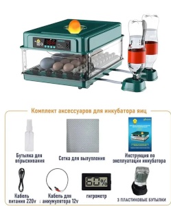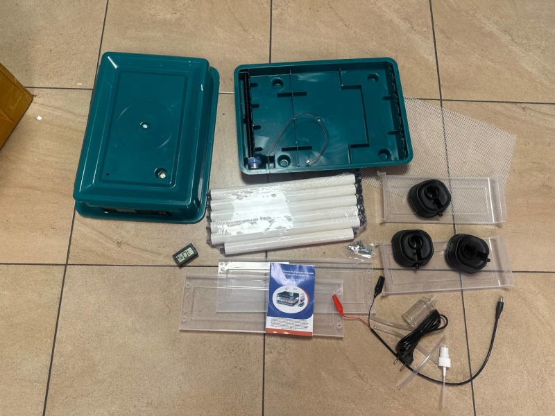 Комплектация: 1.Инкубатор 2.Шнур электропитания 220В. 3. Шнур внешнего питания 12В 4.Руководство пользователя. 5.Устройство подачи воды 6.Сетка для вывода. 7.Пенопластовый кожух для защиты корпуса инкубатора также является дополнительным утеплителем. 8.Крепеж 10.Трубки ПВХ 11.Комплект роликов для универсального лотка.